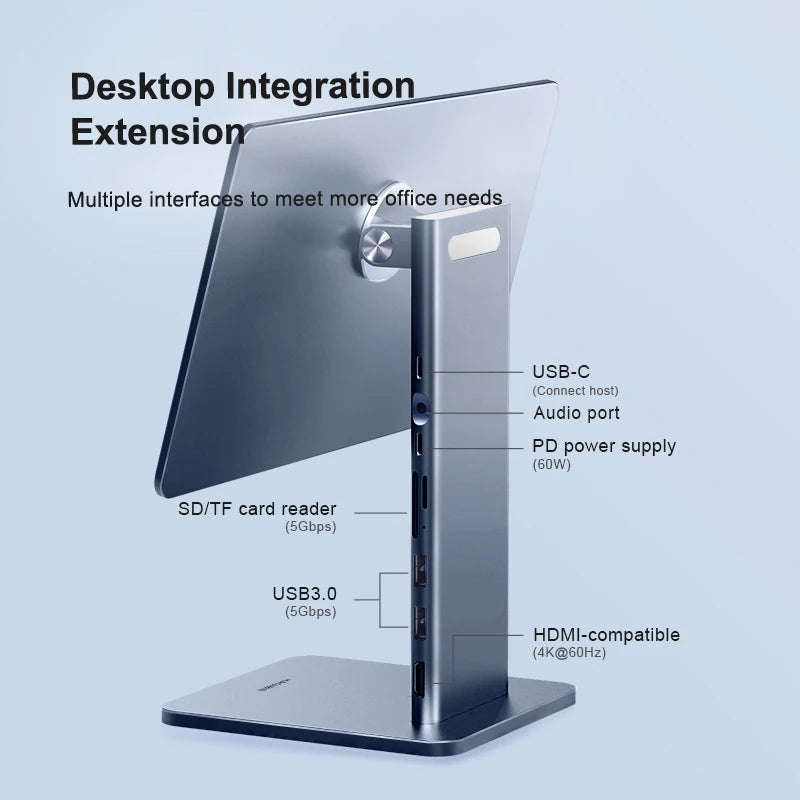 💻 2-en-1 Support & Hub – Inclus : HDMI 4K@60Hz, PD 60W, USB 3.0, AUX, lecteur SD/Micro SD